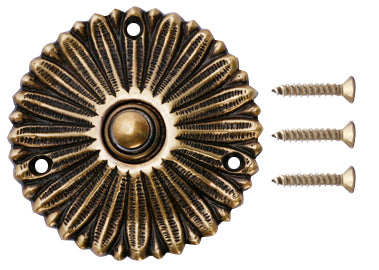 Solid Brass Flower Doorbell Push (Antique Brass Finish) - measures 3 1/3 inches in diameter. Comes complete with the mounting hardware. Uses 24 Volt maximum (standard doorbell circuits). The lost-wax casting process, sometimes known by the French name of cire perdue is an ancient practice that is still used for artwork today and it is used to preserve the fine details of the original components.
