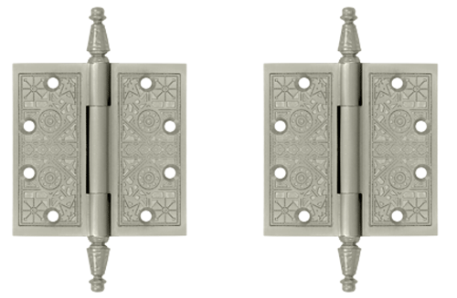 4 1/2 X 4 1/2 Inch Solid Brass Ornate Finial Style Hinge (Brushed Nickel Finish) - Measures 4 1/2 by 4 1/2 inches (not including the finials). Mounts with 8 screws (included).